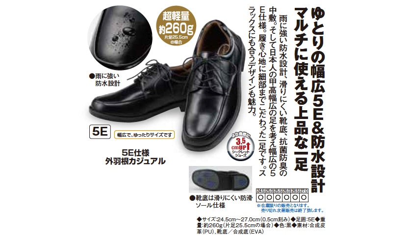 ゆとりの幅広5E&防水設計 マルチに使える上品な一足