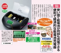 充電式のニッケル水素電池はもちろん、これまで使い捨てていたアルカリ乾電池も再利用できる充電器。こまめに充電すれば5〜10倍も長持ちします。対応する電池サイズは単1、単2、単3、単4、角型9V。過充電防止機能付で充電したまま止め忘れても安心です。